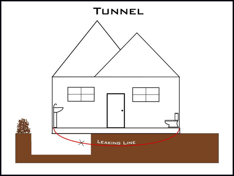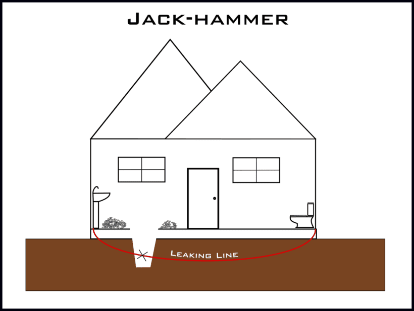 Digging a tunnel is the least invasive way (for the interior of the home) to make the repair. In order to repair a leak in this way, you must start by pinpointing the leak in the same way that you do when you are jack-hammering through the slab.