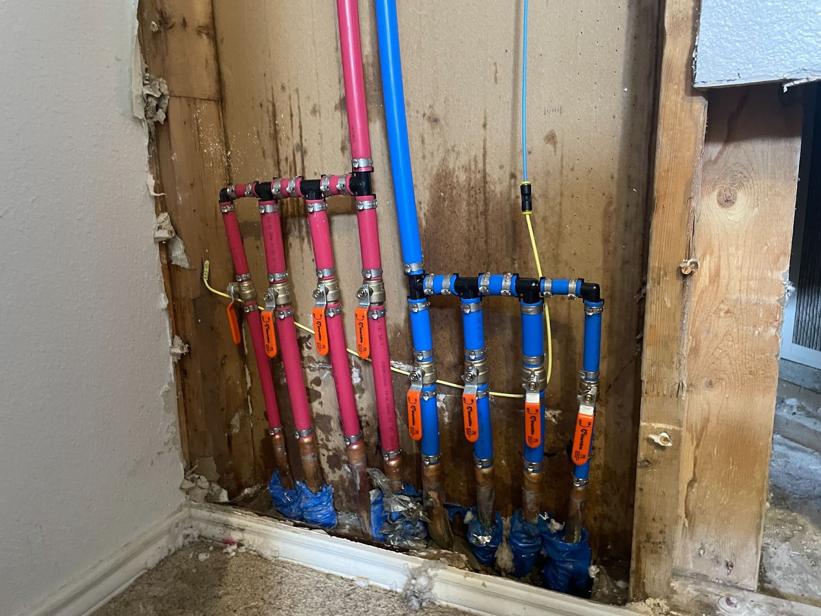 Given the complexities of this two-story home, we faced a critical decision: Should we tunnel under the slab to fix the leak or reroute the affected hot water plumbing lines? After assessing the situation and considering the best long-term solution for the client, we opted for a reroute using PEX piping—a material known for its durability and flexibility, making it an ideal replacement for aging copper pipes.