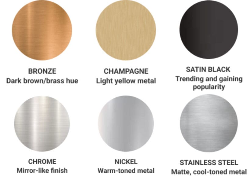 - Champagne: A unique, modern, golden-colored alternative to traditional finishes.