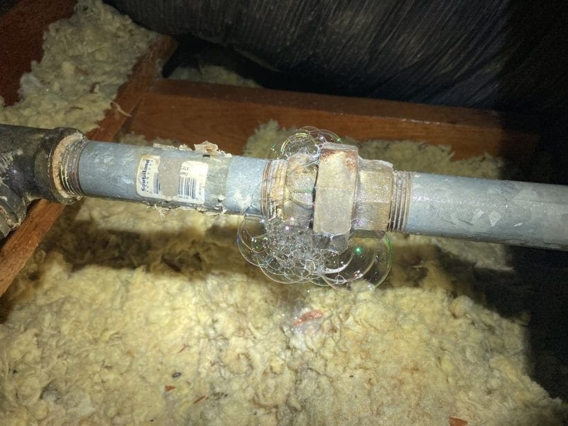 The pipe starts with a larger size where it enters the house (typically 1 1/2″, 1 1/4″, or 1″ IPS depending on the size of the system). As different pipes “tee” off of the main run, they all gradually reduce in size until they reach the appliances (typically at 1/2″ IPS in size). The mainline will usually run through the attic. All of the smaller lines that “tee” off will drop down into walls behind the appliances and then come out where the appliance is hooked up. There should be a shut-off valve at each of these appliances (typically a red, yellow, or older gray handle).